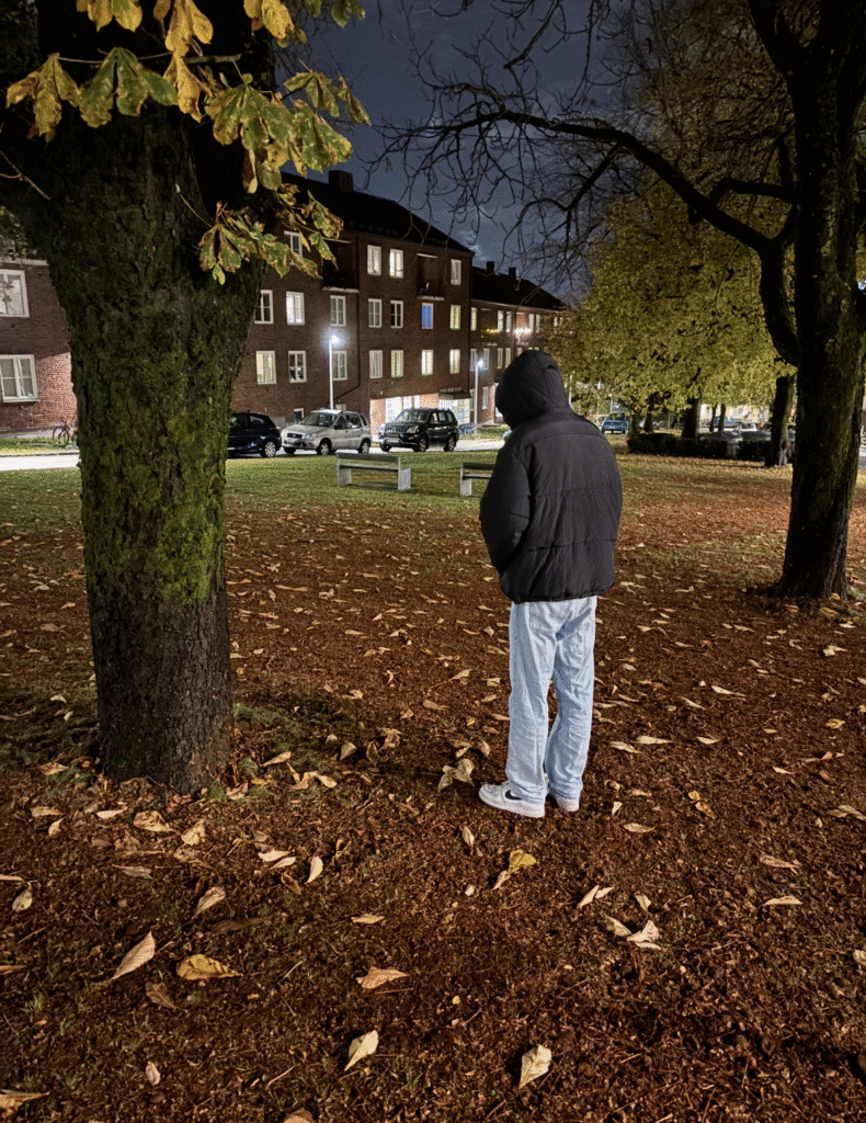 Bilde 2: I dette bildet ønsket jeg å formidle en følelse av ensomhet og utenforskap. Jeg valgte en mørkere location om kvelden, som gjør at motivet virker mer isolert i omgivelsene. Jeg regisserte modellen til å stå med ryggen til kamera og se ned mot bakken, noe som forsterker følelsen av at han er alene og i egne tanker. De halvnakne trærne og det våte høstløvet understreker en litt trist stemning. Noe jeg kunne forbedret er å jobbe mer med komposisjonen for å unngå visuell støy i bakgrunnen, som bilene og lysene.