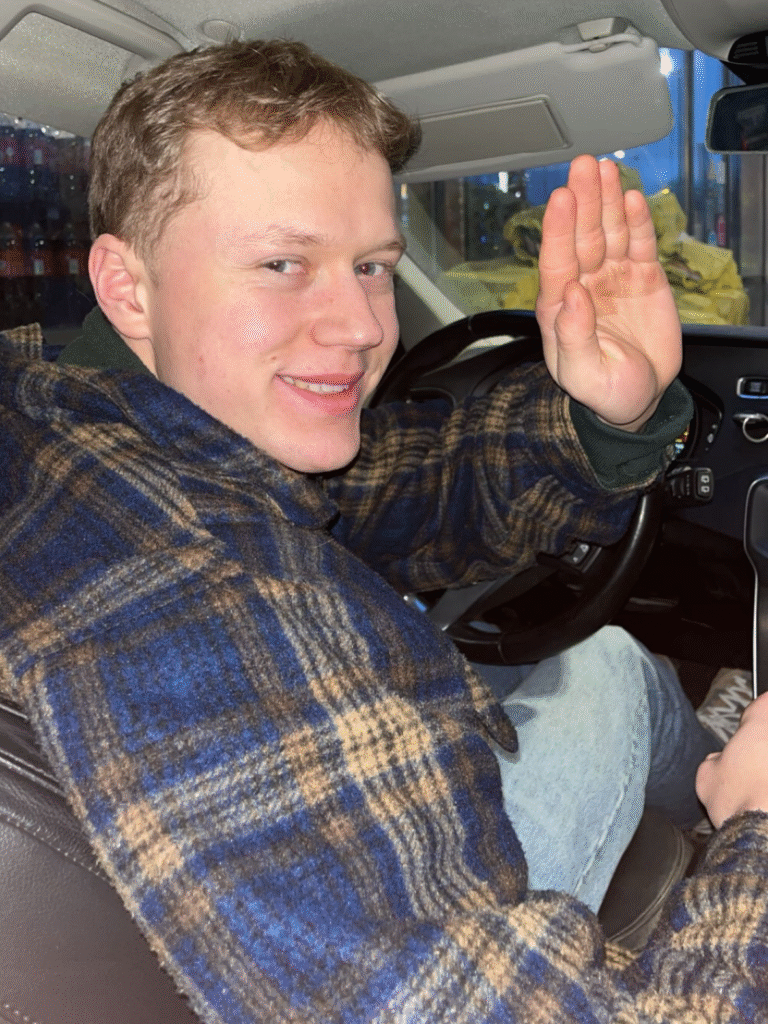 Bilde 4: I dette bildet ønsket jeg å skape en lys, energisk og litt humoristisk stemning. Jeg valgte å bruke blitz for å fremheve ansiktet og uttrykket til modellen, noe som gir bildet et spontant og hverdagslig preg. Locationen er inne i en bil, som gjør bildet mer intimt og personlig. Jeg ba modellen om å snu seg mot kamera og løfte hånden, som et vink, noe som skaper et vennlig, inviterende og uformelt uttrykk. Komposisjonen er tett og fokusert på motivets ansikt og kroppsspråk. Noe jeg kunne forbedret her er å unngå de distraherende elementene i bakgrunnen.