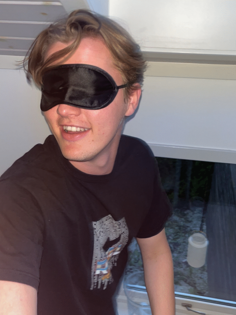 Bilde 5: I dette bildet ønsket jeg å skape en følelse av å være litt “lost”, men på en lett og positiv måte. Sovemasken gjør at motivet ikke ser hvor han er på vei, noe som gir bildet et uttrykk av usikkerhet og spontanitet. Samtidig viser smilet hans at han tar situasjonen med godt humør, noe som skaper en kontrast mellom uvisshet og glede. Noe jeg kunne forbedret er å redusere refleksjonene i lyset for et jevnere resultat.