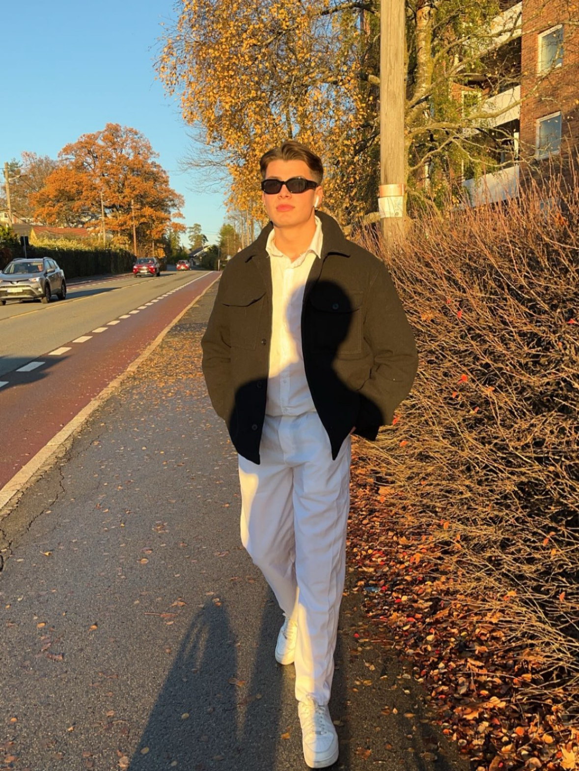 Bilde 1: I dette bildet ønsket jeg å skape en god og varm stemning. Jeg fotograferte motivet i “golden hour” for å få et gyllent lys som fremhever både dybde og fargene i omgivelsene. Locationen er en rolig gate om høsten, og dette gir bildet en naturlig og rolig atmosfære. Jeg regisserte modellen til å gå rolig fremover med hendene i lomma, noe som gir et avslappet men samtidig selvsikkert uttrykk. Noe jeg føler jeg kunne forbedret på dette bildet er å unngå at skyggen min syns.